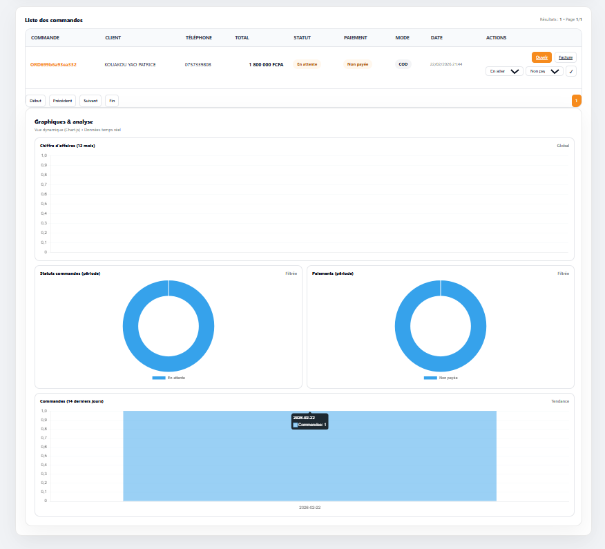 Paiements disponibles : Mobile Money, Wave, carte, virement. Confirmation de commande systématique.